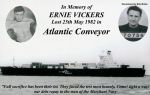 In 2005 I was present at the unveiling of the Merchant Navy Falklands Memorial at Tower Hill in London where I laid a wreath in honour of Ernie Vickers and have done every year since. I never knew Ernie personally, but we both shipped out of Middlesbrough Shipping Federation at the time situated in the Dundas Arcade at Middlesbrough. When the war started I was on a ship laid up in Australia's Sydney Harbour awaiting a cargo of coal for Japan, and was in Japan when the Argentineans surrendered. When I came home on leave I heard the story of the loss of the Atlantic Conveyor and Ernie's death and I never ever forgot his name. Ernie Vickers was born Middlesbrough 1924 and before he went to sea he had been a professional Welterweight boxer and at the height of his career in the 50's & 60's took him to the Northern Area Welterwight Championship. After 57 professional fights, his record was: Won 38, lost 19, drew