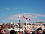 The following morning, Thursday, the Little Ships set sail for Dunkirk and a special commemoration arranged there by the town. Only four Standards made it to the pier head, (at 06.30 / 07.00!) Vindicatrix, Royal Marines, RNA and PWSTS plus a Scots piper in full rig, where we were joined by hundreds of the general public filling both arms of the breakwater. It was an incredible turnout at that time of day and we were blessed with a wonderful English morning of bright sunshine, blue, blue skies, a few white fluffy clouds here and there and more importantly, a flat sea giving perfect sailing conditions that made it ideal but I guess it wouldn't be like that later in the day as they made their way across the Channel. (You remember the Channel huh? I'm sure you do!) We raised and dipped appropriately with lots of waves and smiles from the crews passing below, it was low tide which drew a comment or two to the Highland piper from the ladies, and all the crews were a little surprised and very appreciative too, and not only to the piper.